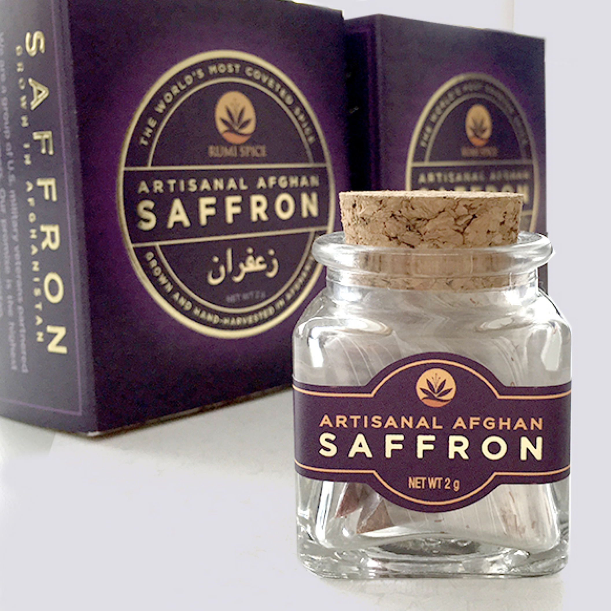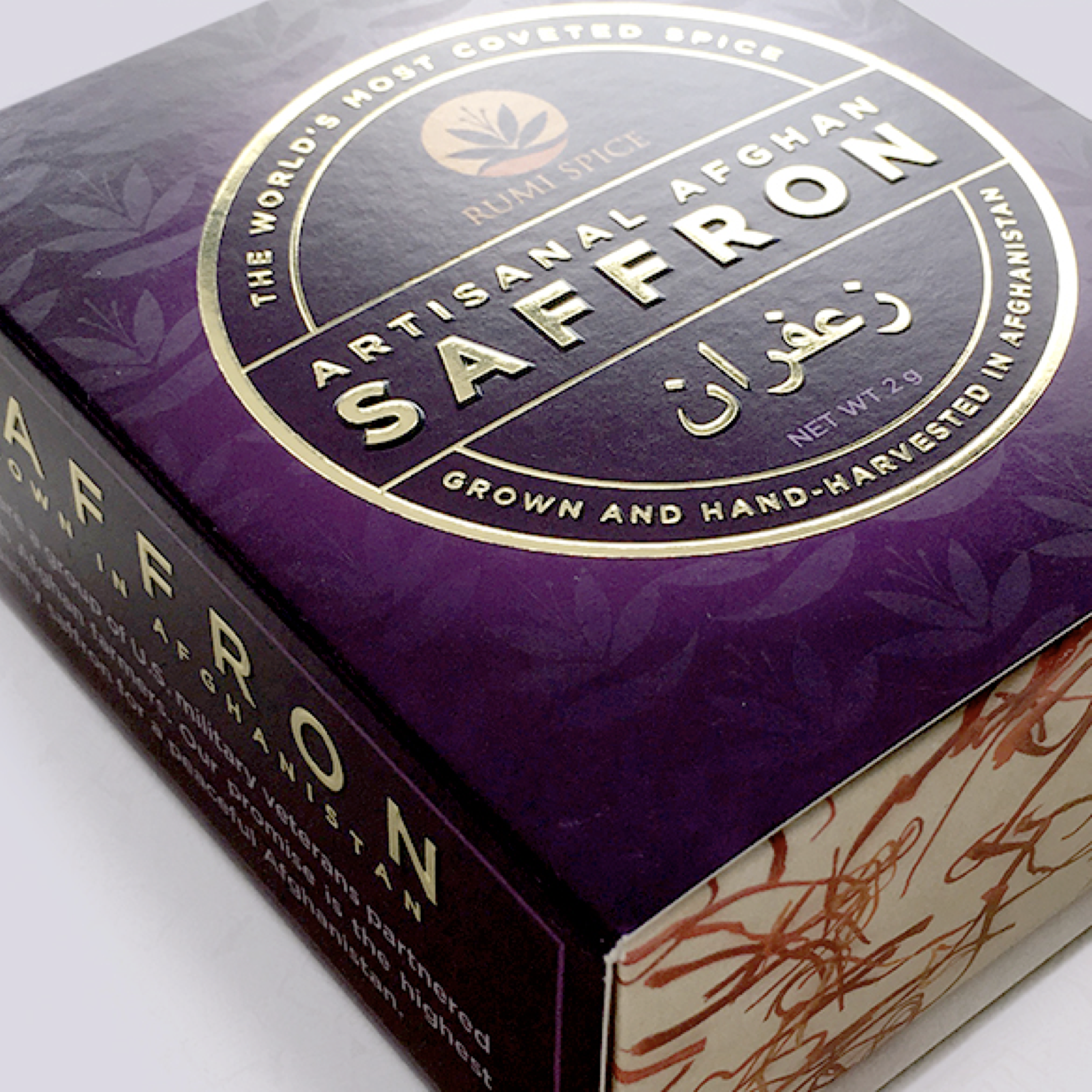 A unique brand story like Rumi Spice needs an equally unique package. Premium saffron, cultivated by Afghani farmers and imported by former US military personnel, needed to tell a story and project quality from first glance. This design utilized embossing, foil stamping, gloss and matte varnish for maximum impact at retail.