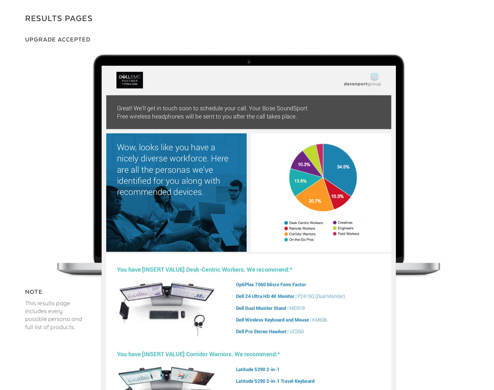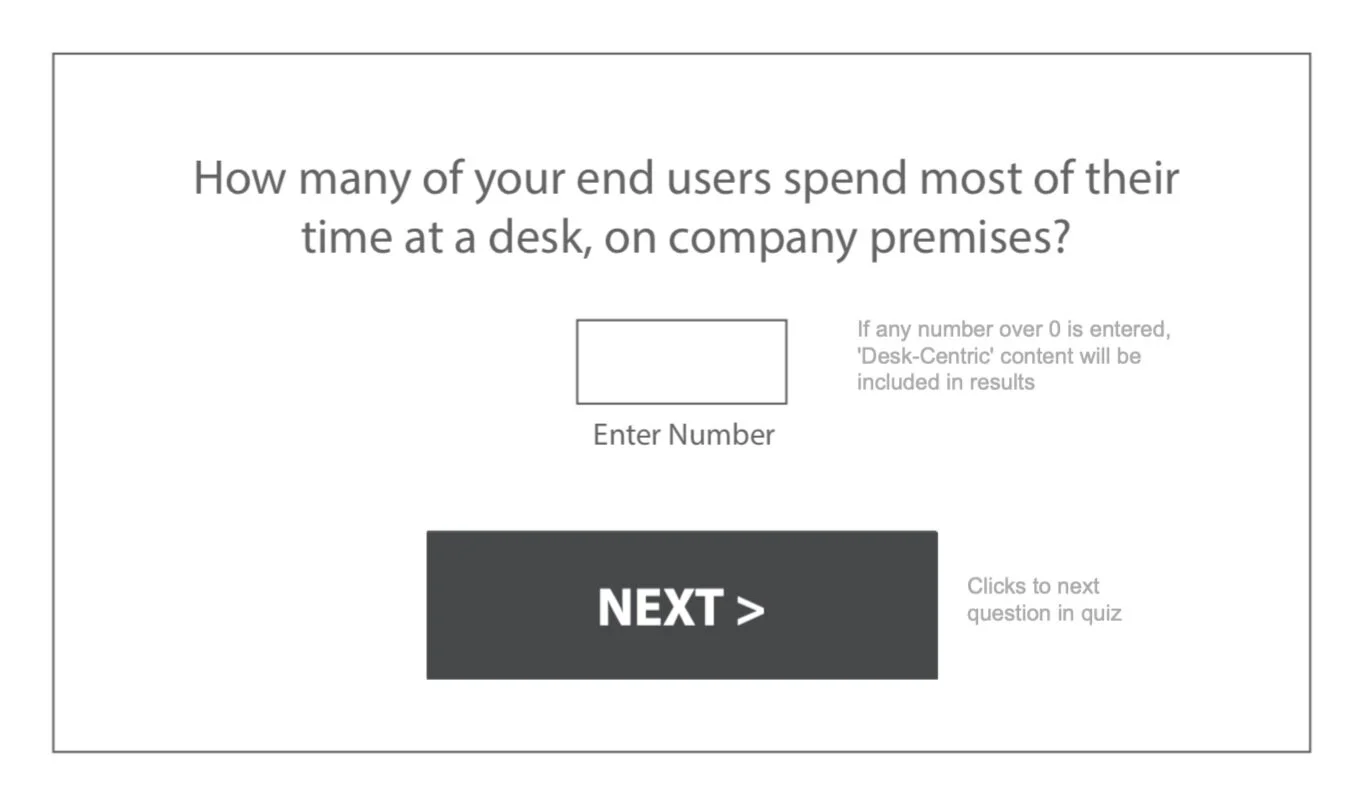 In an effort to deliver more targeted, more relevant equipment recommendations to IT managers, we designed a quiz interface to define an organization’s workforce and deliver specific systems suggestions unique to their needs. Click here to view PDF prototype.